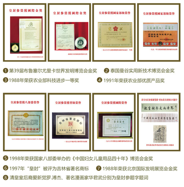 2010“皇封”品牌被中華人民共和國商務(wù)部授予,“中華老字號”稱號。并于2011年,皇封參陸年根人參取得中國、美國、歐盟有機認證,成為人參行業(yè)中唯一一家通過歐盟、美國及中國農(nóng)業(yè)部三大權(quán)威有機產(chǎn)品檢測機構(gòu)認證的人參企業(yè)。